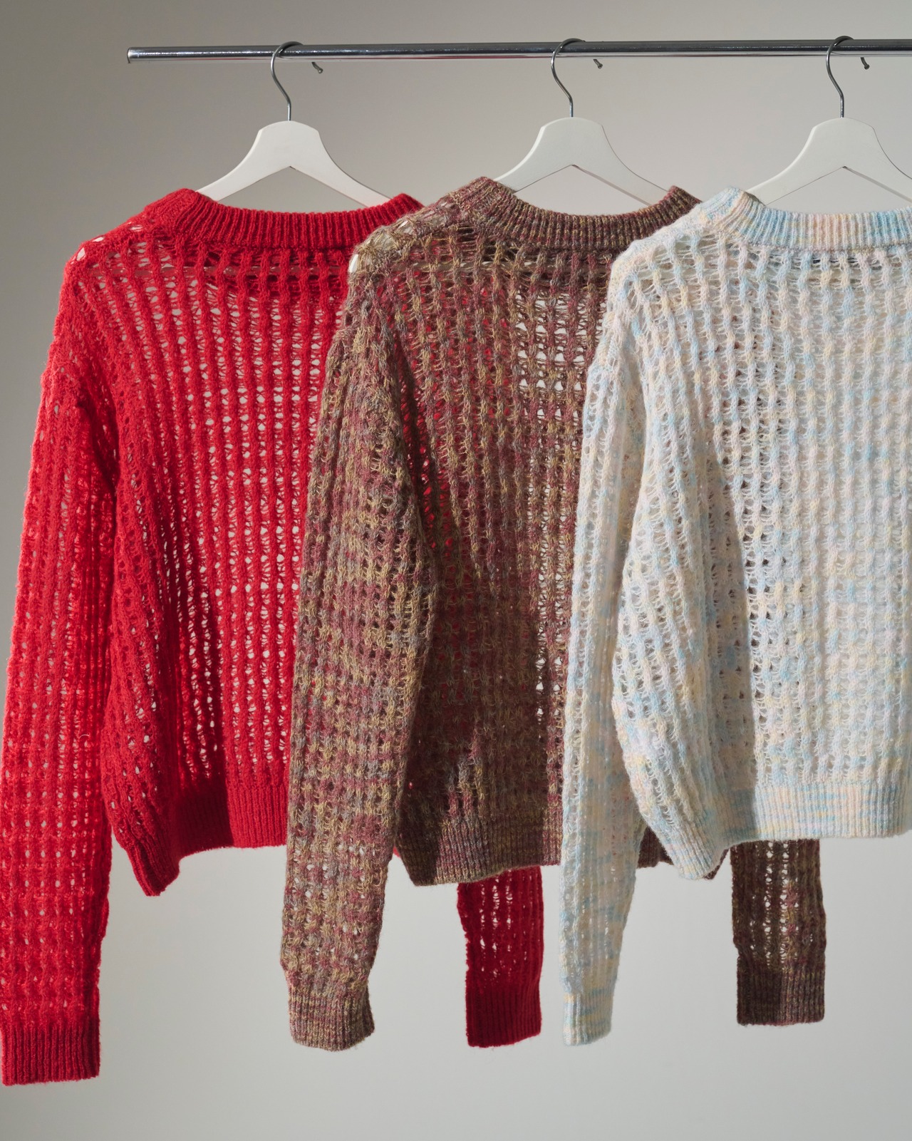 肌触りの良いふわふわとした糸で編まれた絶妙なレッドのローゲージニット。どんなシーンでも心地よくご着用頂けるアイテムです。リラックス感のあるシルエットでありながら、洗練された雰囲気を持ち合わせたデザイン。厚みのあるクルーネックが上品さと、奇抜になりすぎない個性を演出してくれます。 2色の糸を巧みに使用した絶妙なレッドのカラーリングが特徴で、独自の存在感を放っています。RUSKA VAUNIオリジナルのレッドベルベットカラーをお楽しみください。